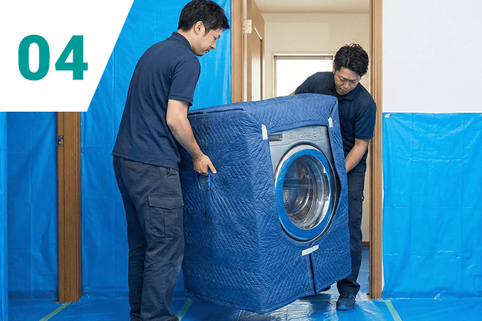 数多くの搬出経験をもとに、大型冷蔵庫や洗濯機など、壁や床を傷つけないように養生します。
